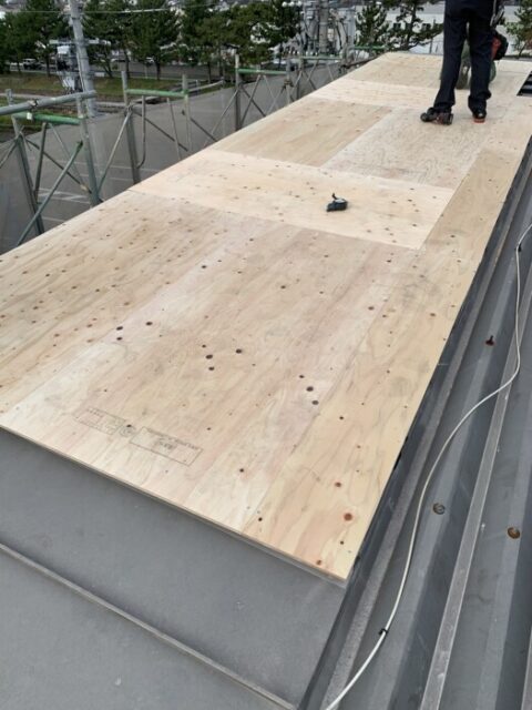 照明器具のアングルを撤去移設してから 勾配を付けて屋根下地の施工です。逆流しても、店舗内に入らない様に外壁の外に雨水が落ちる様に施工しました。