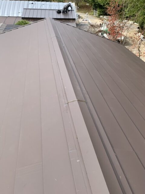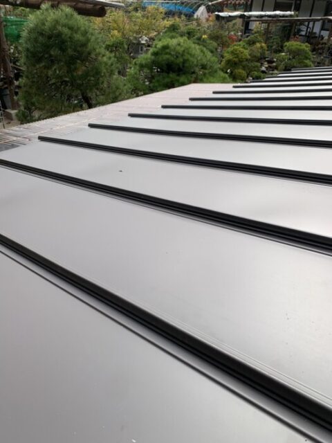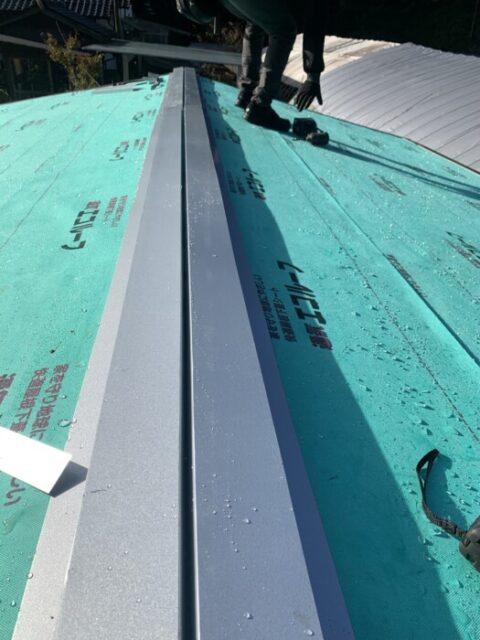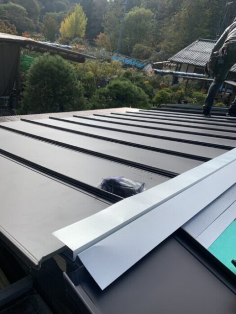 既存の古い瓦を撤去してからの木下地 その上に新設のガルバリウム立平葺です(嵌合式)
