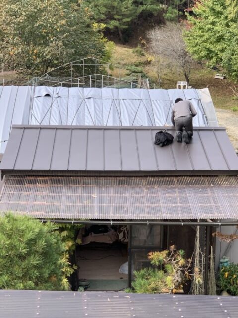 広島県広島市を拠点に、板金屋根工事、外壁工事、雨樋工事など承っている、有限会社山本板金です 自社施工による工事なので、中間マージン経費が必要ないので経済的な予算での工事が可能です 。某盆栽園の作業場事務所の屋根改修工事です